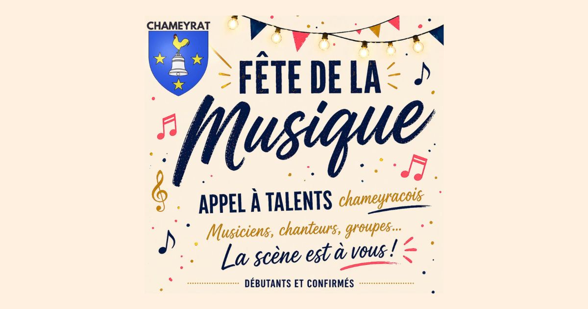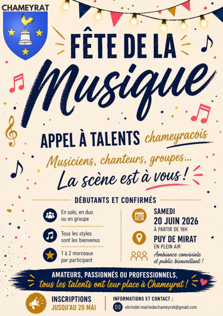 Musiciens, chanteurs et groupes chameyracois sont invités à se produire sur la scène du Puy de Mirat, le samedi 20 juin 2026 à partir de 18 heures.